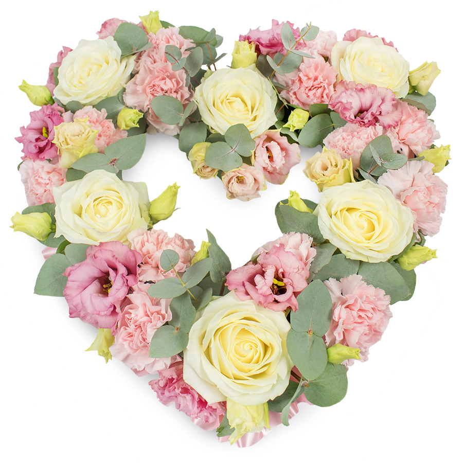 A carefully crafted heart-shaped funeral wreath sits in sharp focus against a bright white background, every bloom contributing to a story of love and remembrance. The heart is complete and symmetrical, filled edge to edge with flowers so that no base is visible, giving the impression of a soft, floral cushion. At intervals around the curve, fully open cream and pale lemon roses serve as gentle anchors; their petals are tightly layered at the centre, then gradually relax into broader, velvety outer petals that catch the light. These are surrounded and supported by generous sprays of pastel pink carnations, their frilled, almost lace-like edges folding over one another to create a delicate, comforting texture. Scattered through the design, deeper pink and mauve lisianthus blossoms provide contrast, their slightly more relaxed, trumpet-shaped petals and darker throats adding a sense of depth and a hint of quiet drama. Cool, silvery eucalyptus leaves weave among the flowers, their smooth, rounded shapes and soft grey-green colour lending freshness and a subtle, herbal scent that recalls the calm of a slow walk along Lower Clapton's tree-lined streets. Tiny yellow-green buds dot the arrangement, signalling new beginnings amidst sorrow. The tight, abundant placement of flowers makes the heart feel generous and intentional, as though each stem has been chosen to speak of tenderness, sympathy, and gratitude. It is the kind of tribute a family in Lower Clapton might choose for a funeral, memorial, or celebration of life service, a heartfelt gesture that reflects both personal affection and the quiet support of the local community.